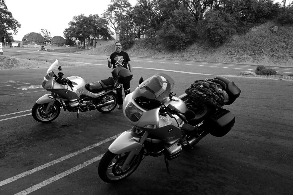 Finally, I got out of the park! I headed back down the road, like the whatever it is, like the county road that leads into the park from the south that I had come in on the night before [NOTE: E. Kings Canyon Rd, aka 180]. I saw a filling station. “You know what, I’ll pull over here. I think I have service again, now that I’m out of the park. I’m going to make some calls.” I pull in into the lot and in the parking spot next to me: another 2002 BMW 1150 RS. I can’t fucking believe it.