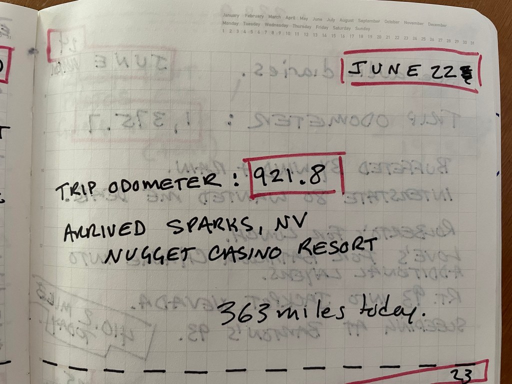 I’m going to write for June 22nd, “arrived Sparks Nevada, Nugget Casino ‘Resort.'” Resort should definitely be in quotes. June 23rd will be, “Day of Sierra BMW GPS saga.” Now if I go to today, I will say, “Buffeted by wind and rain. Interstate 80 wanted me dead.” I wrote, “dear,” dead. Then I’m going to write, “Rolberto’s. Not Roberto’s. Rolberto’s for lunch. Love’s for bathroom change into additional layer.” Oh, God, layers, “Route 93 into Jackpot.” It’s literally called Jackpot. “Jackpot, Nevada. Sleeping at Barton’s 93.”